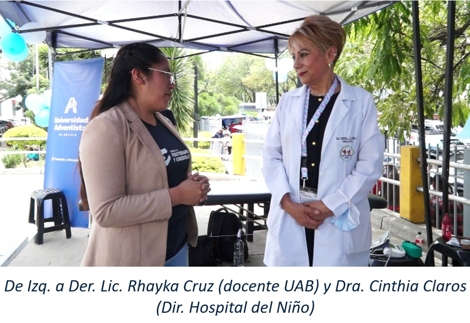 Este viernes 07 de noviembre la carrera de Fisioterapia y Kinesiología de la Universidad Adventista de Bolivia (UAB) participó de la Feria organizada por el Hospital del Niño Manuel Ascencio Villarroel en honor a sus 20 años como hospital independiente.