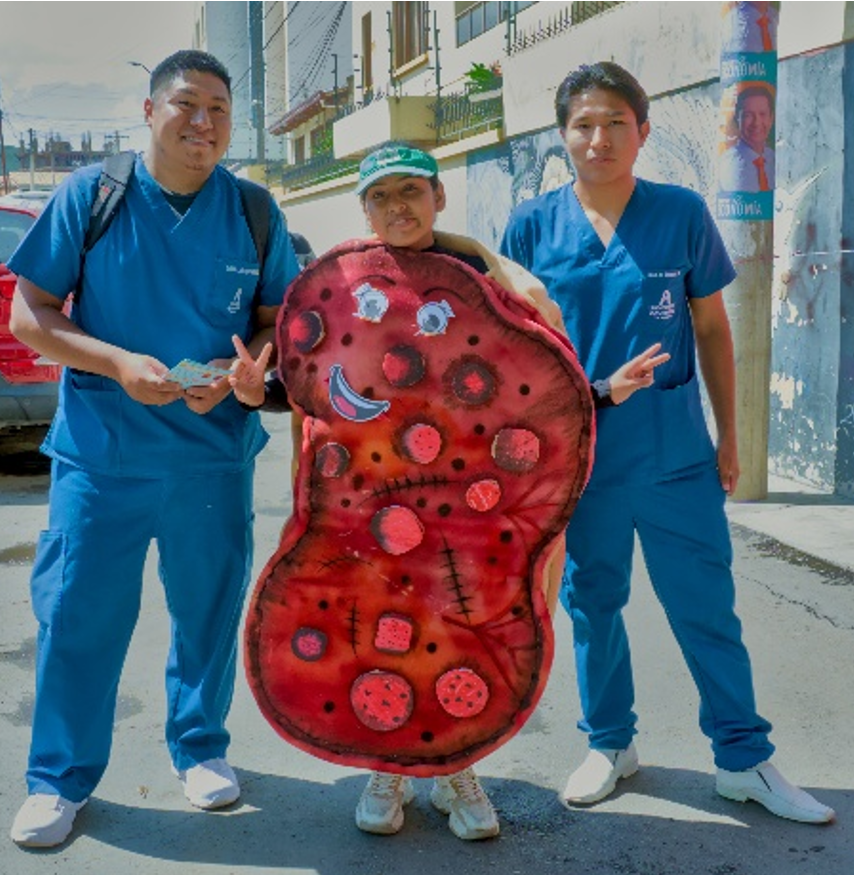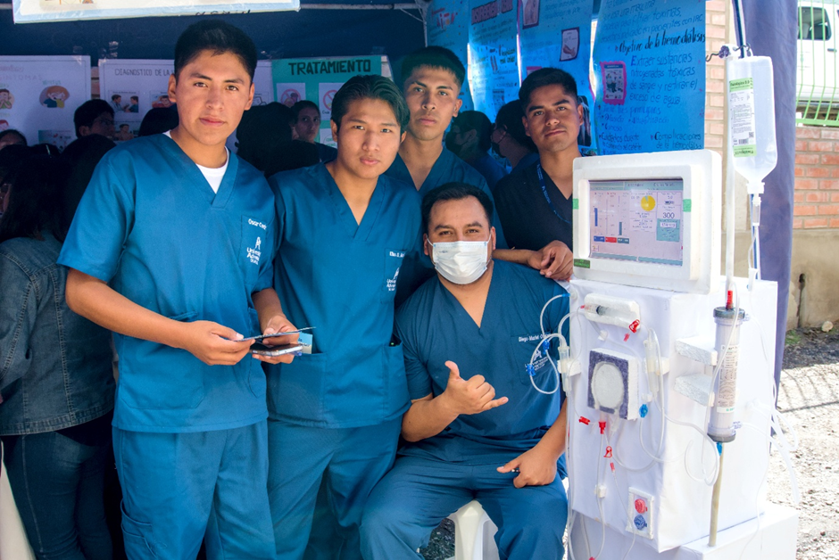 Cochabamba. – Estudiantes de la carrera de Enfermería participaron este jueves 12 de marzo, en la feria de salud organizada por el centro de hemodiálisis HEMO D con motivo del Día Mundial del Riñón. La actividad se centró en la prevención de enfermedades renales crónicas mediante la educación y el control de parámetros básicos de salud.